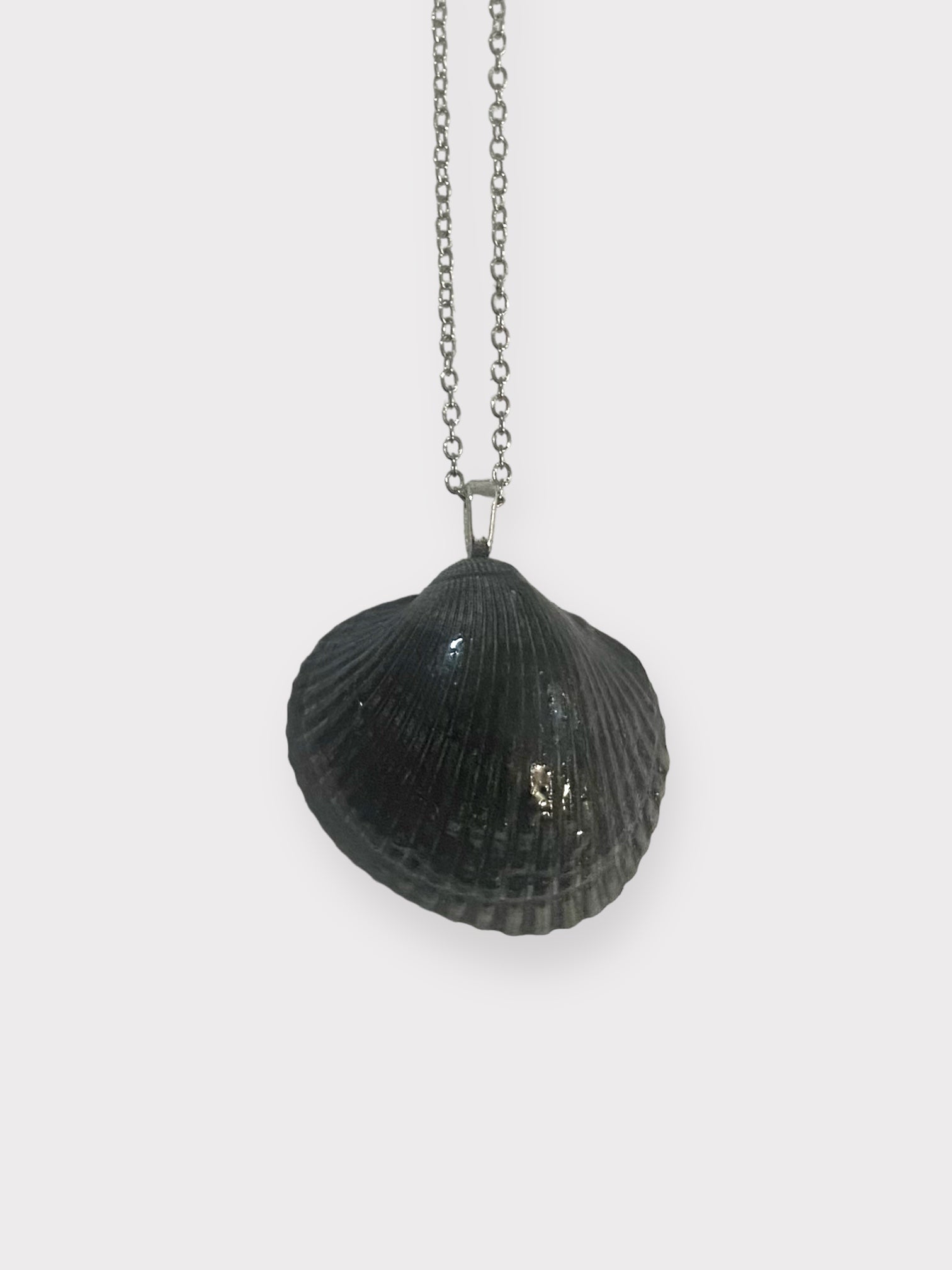 The BLACK COCKLE necklace features a polished Rockaway Beach shell on a 20" stainless steel chain, finished with SGJ's signature toggle closure and clasp charm.