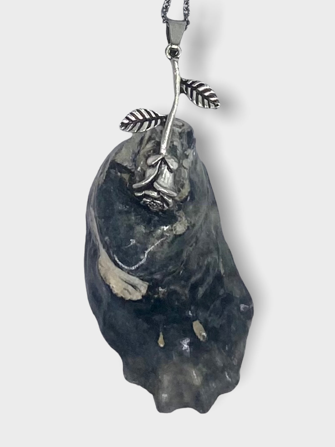 The BRIAR ROSE NECKLACE features a Rockaway Beach shell mounted on a silver-tone rose.