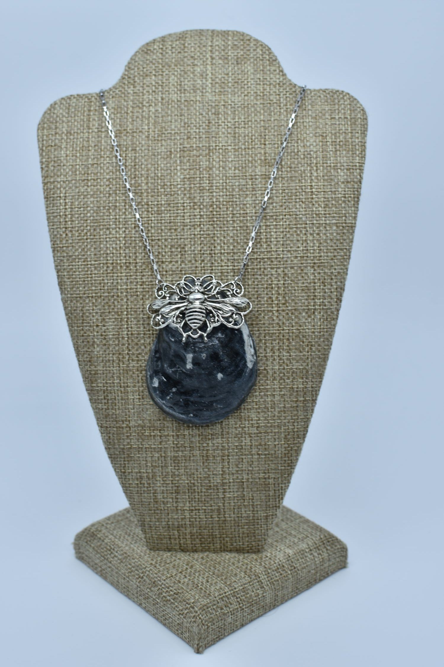 The BUG OUT FILIGREE NECKLACE features a silver-tone bee perched on a large Rockaway Beach shell.