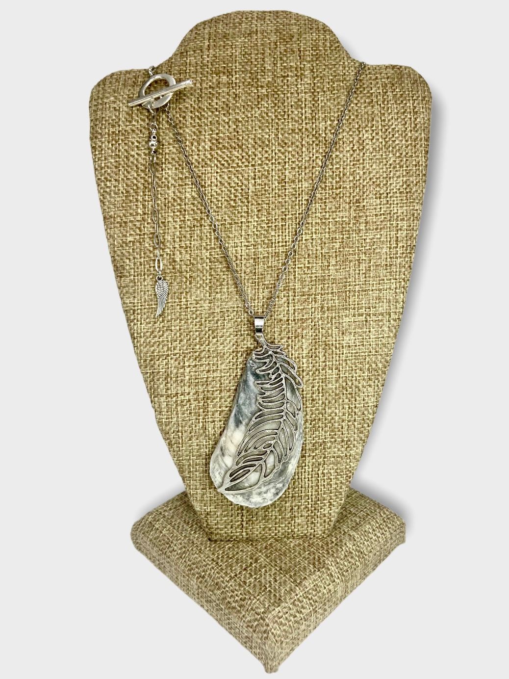 The FEATHERED FRIEND NECKLACE features an elegant silver-tone feather mounted on a polished Rockaway Beach shell.