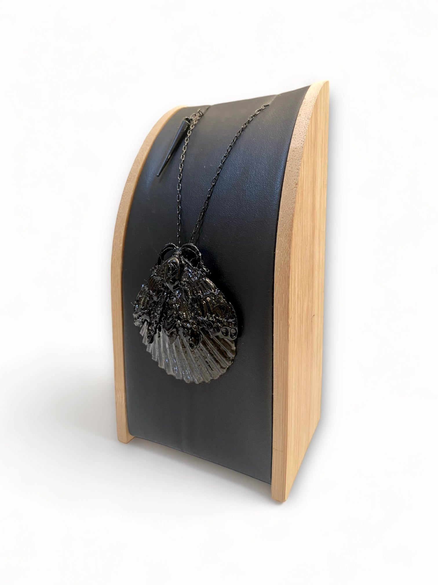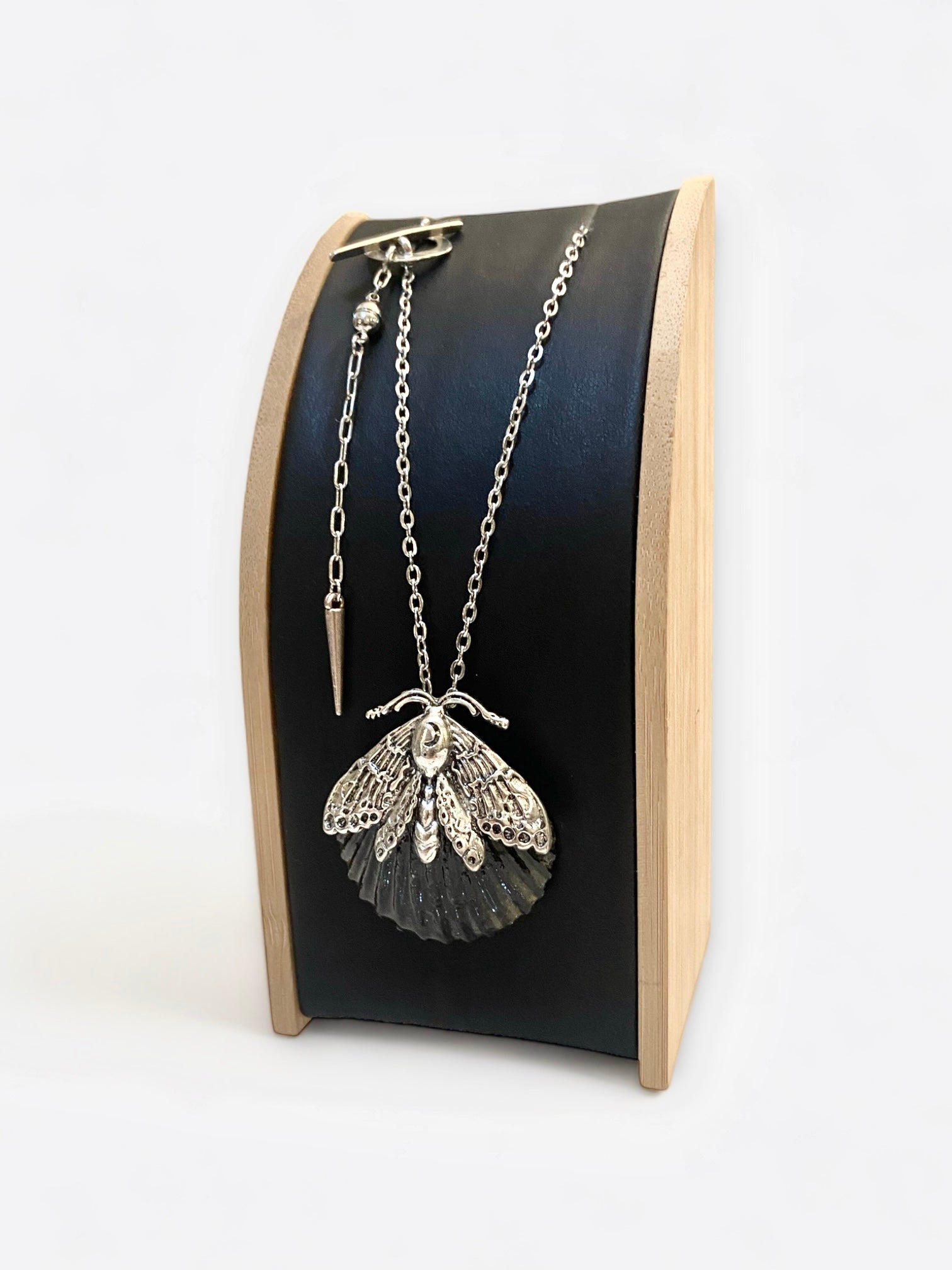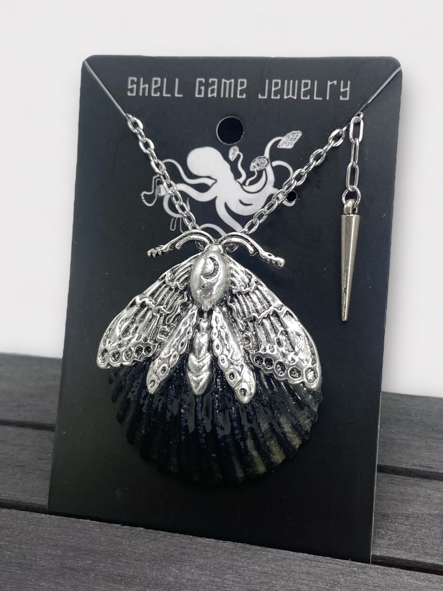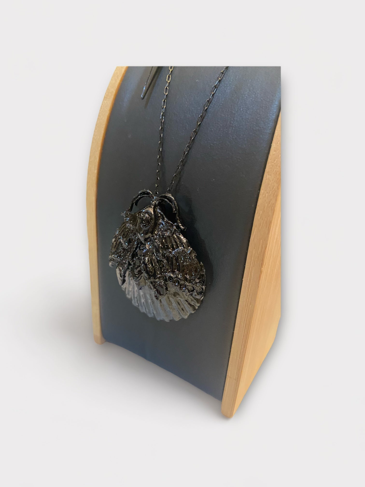 The NOCTUIDAE line features delightfully-detailed moths perched on polished scallop shells. Pendants measure 1-2" on 20" chains, and are finished with SGJ's signature toggle closure and cone rivet clasp charm. Available in CLOUDED SILVER, BLACK WITCH, and CINNABAR.