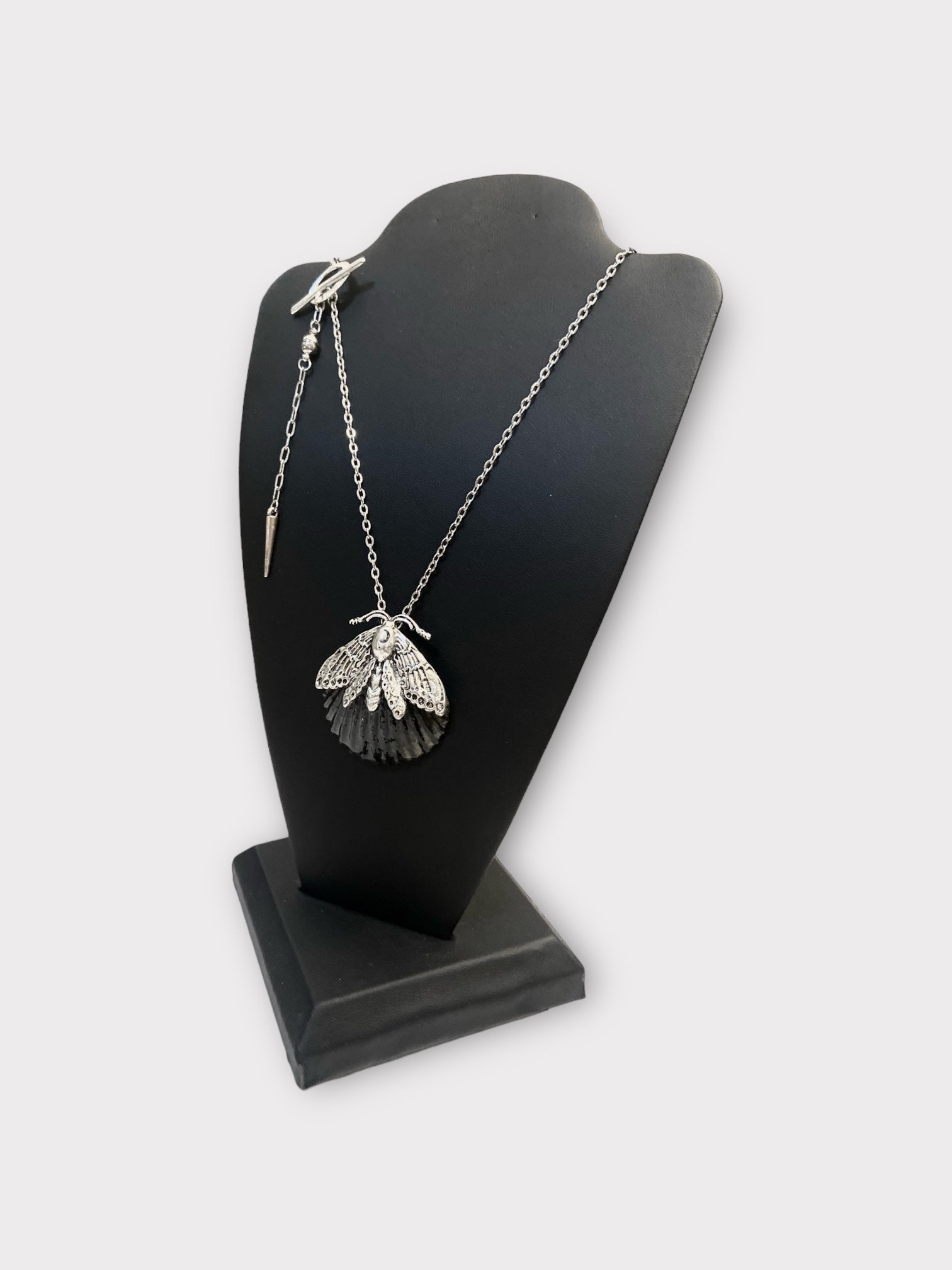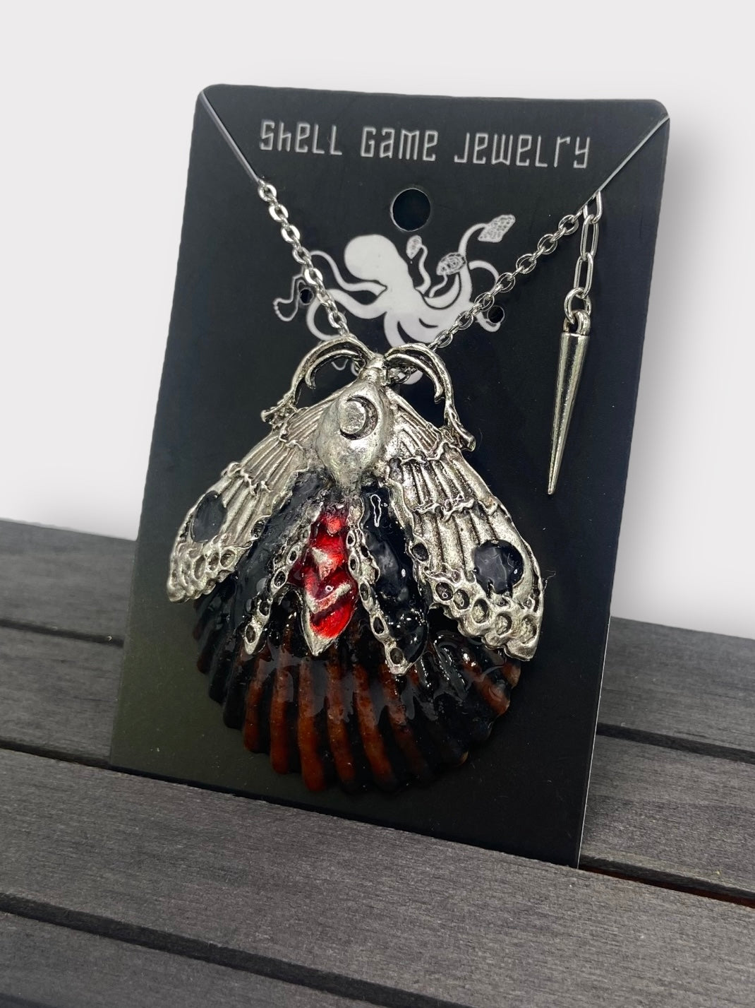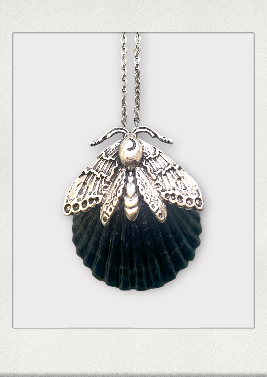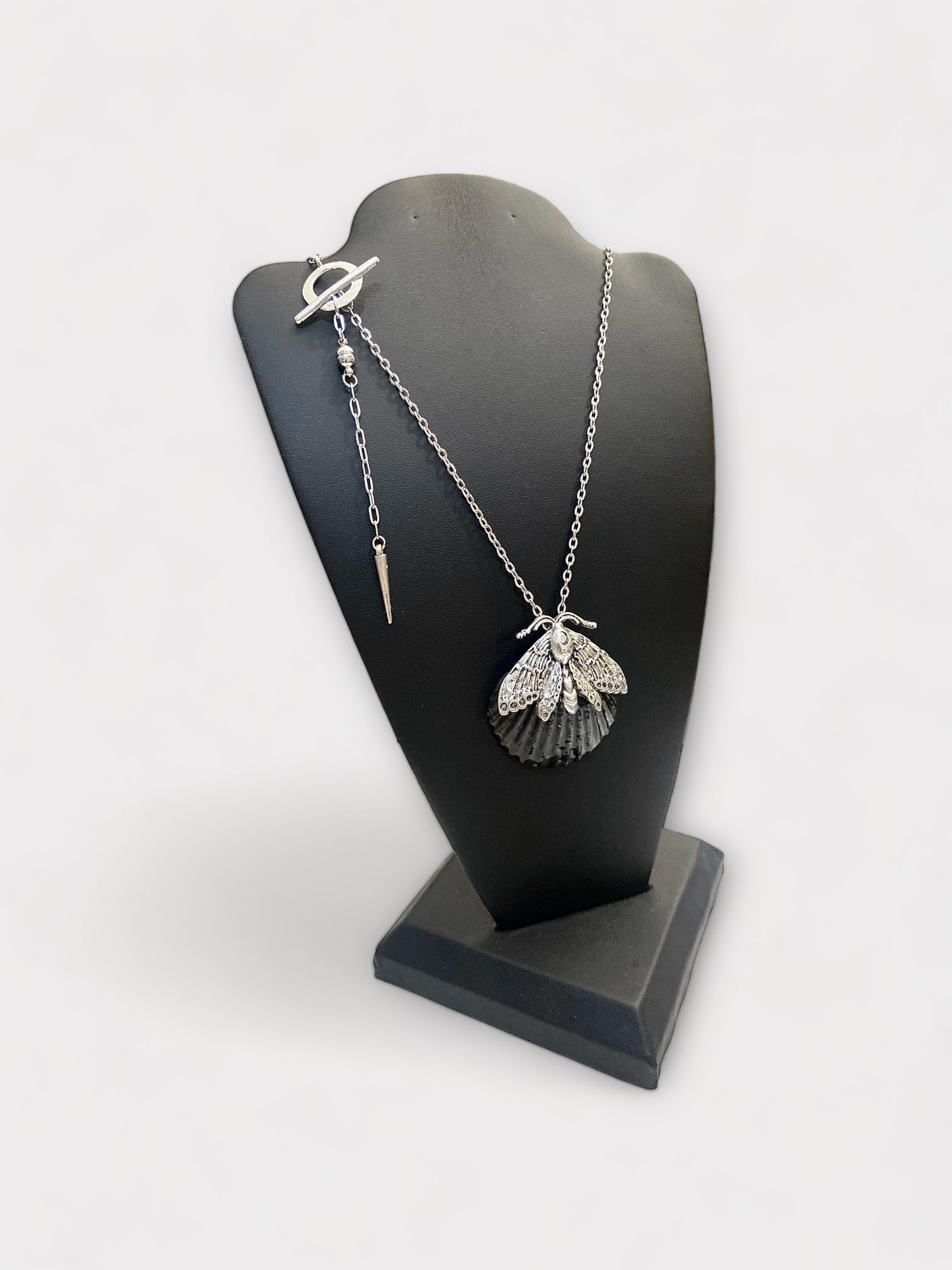 The NOCTUIDAE line features delightfully-detailed moths perched on polished scallop shells. Pendants measure 1-2" on 20" chains, and are finished with SGJ's signature toggle closure and cone rivet clasp charm. Available in CLOUDED SILVER, BLACK WITCH, and CINNABAR.