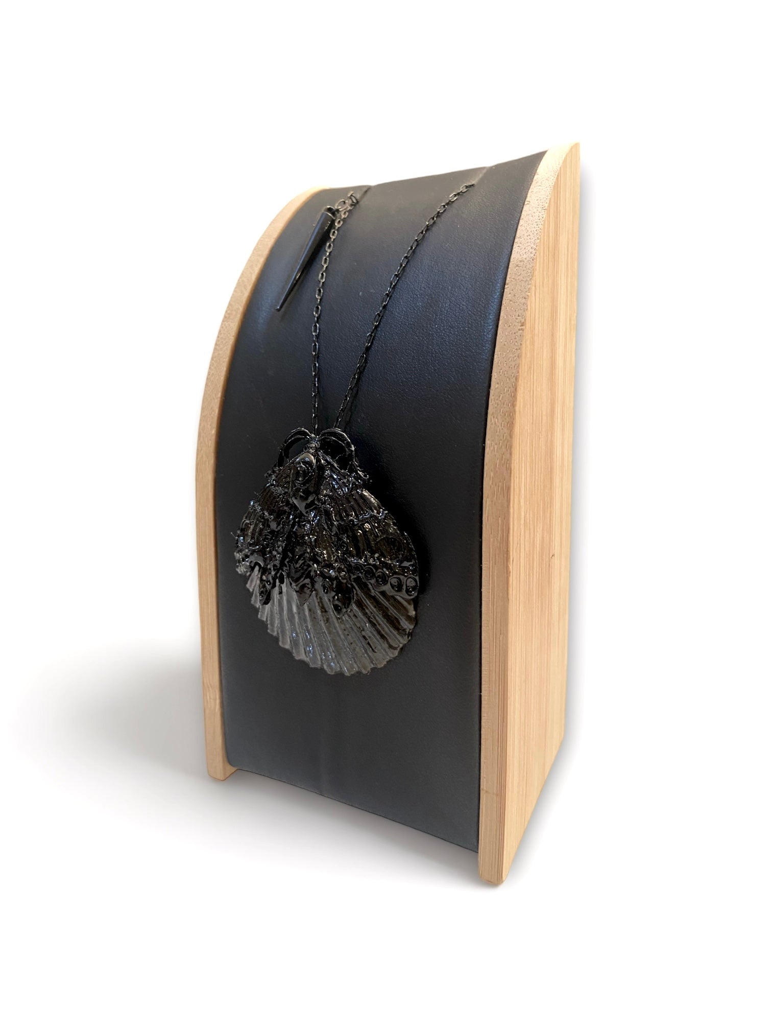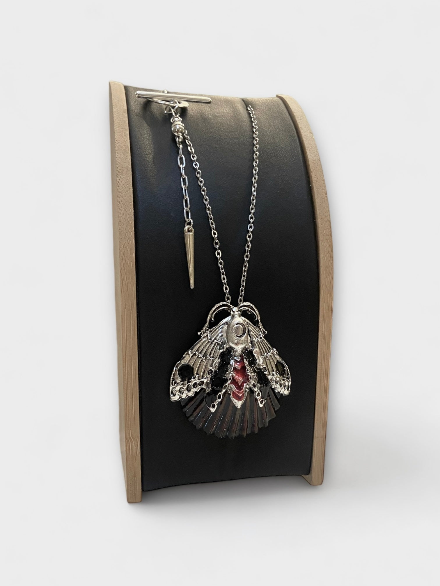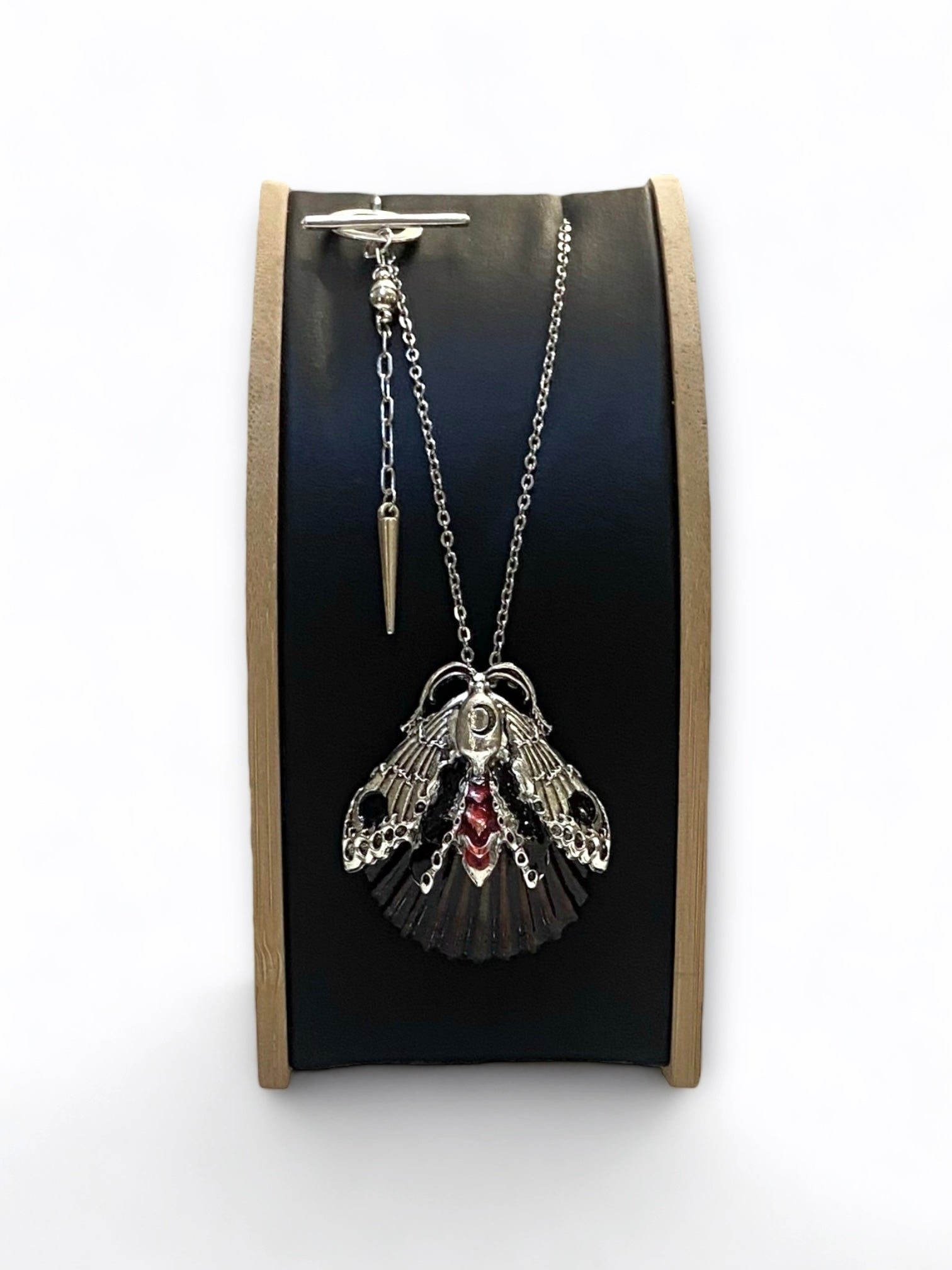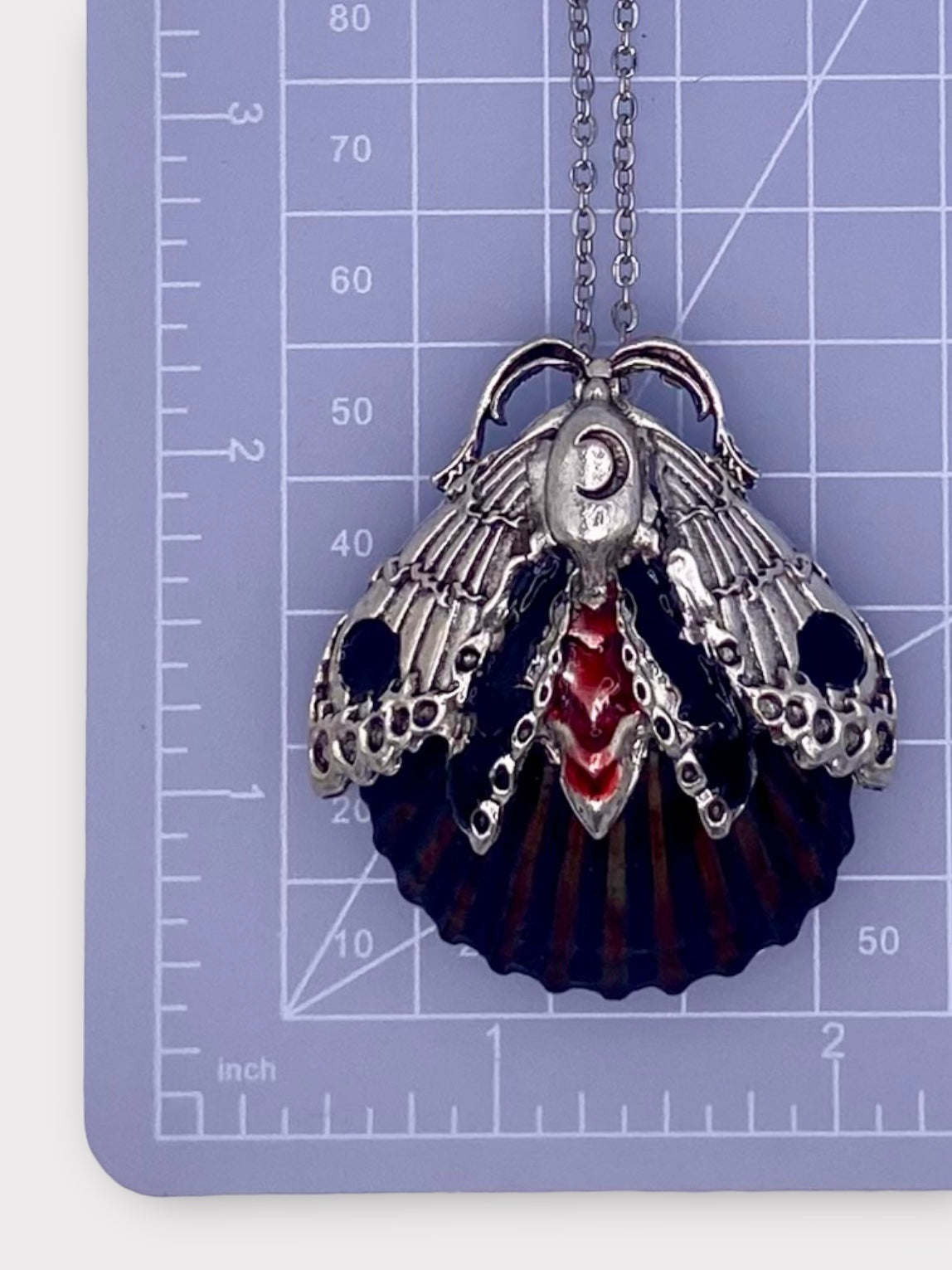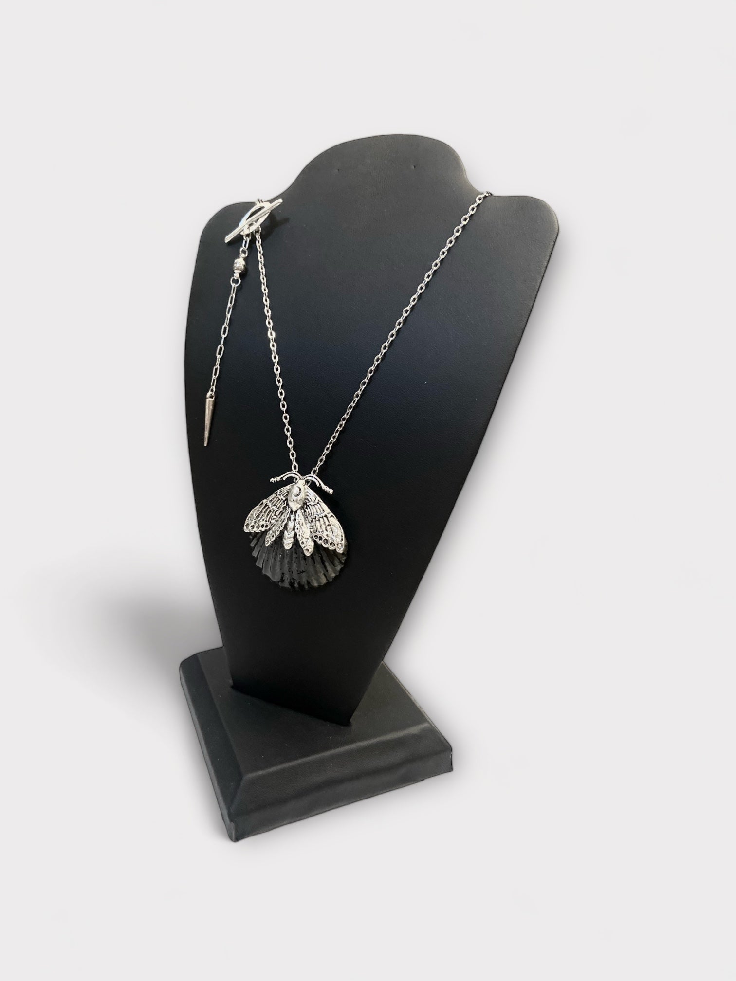 The NOCTUIDAE line features delightfully-detailed moths perched on polished scallop shells. Pendants measure 1-2" on 20" chains, and are finished with SGJ's signature toggle closure and cone rivet clasp charm. Available in CLOUDED SILVER, BLACK WITCH, and CINNABAR.