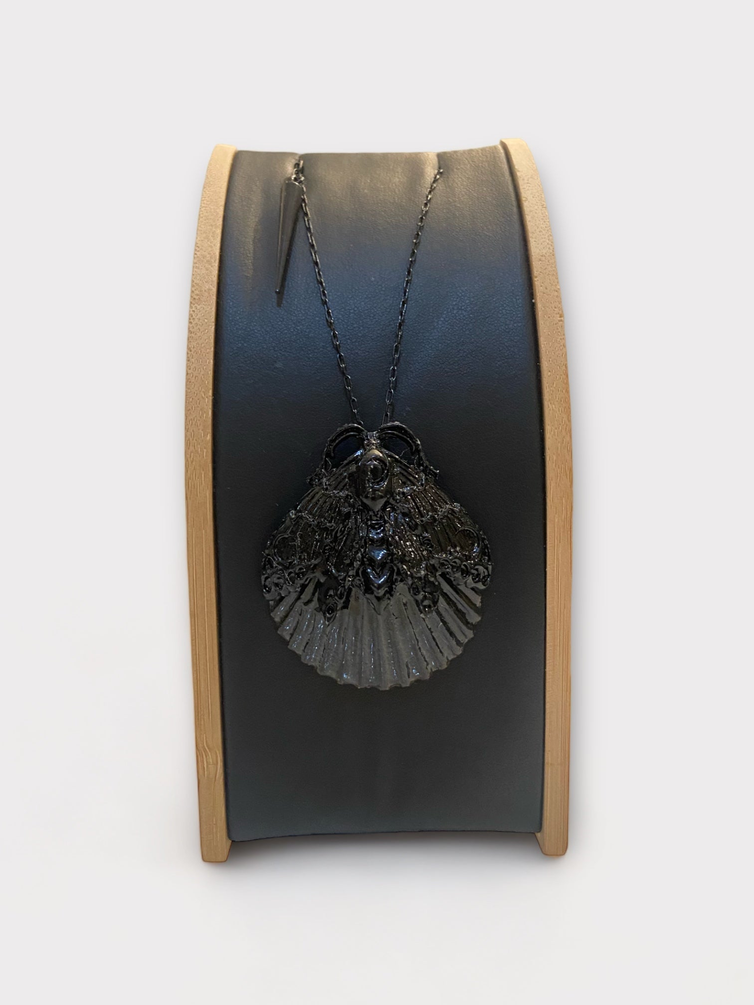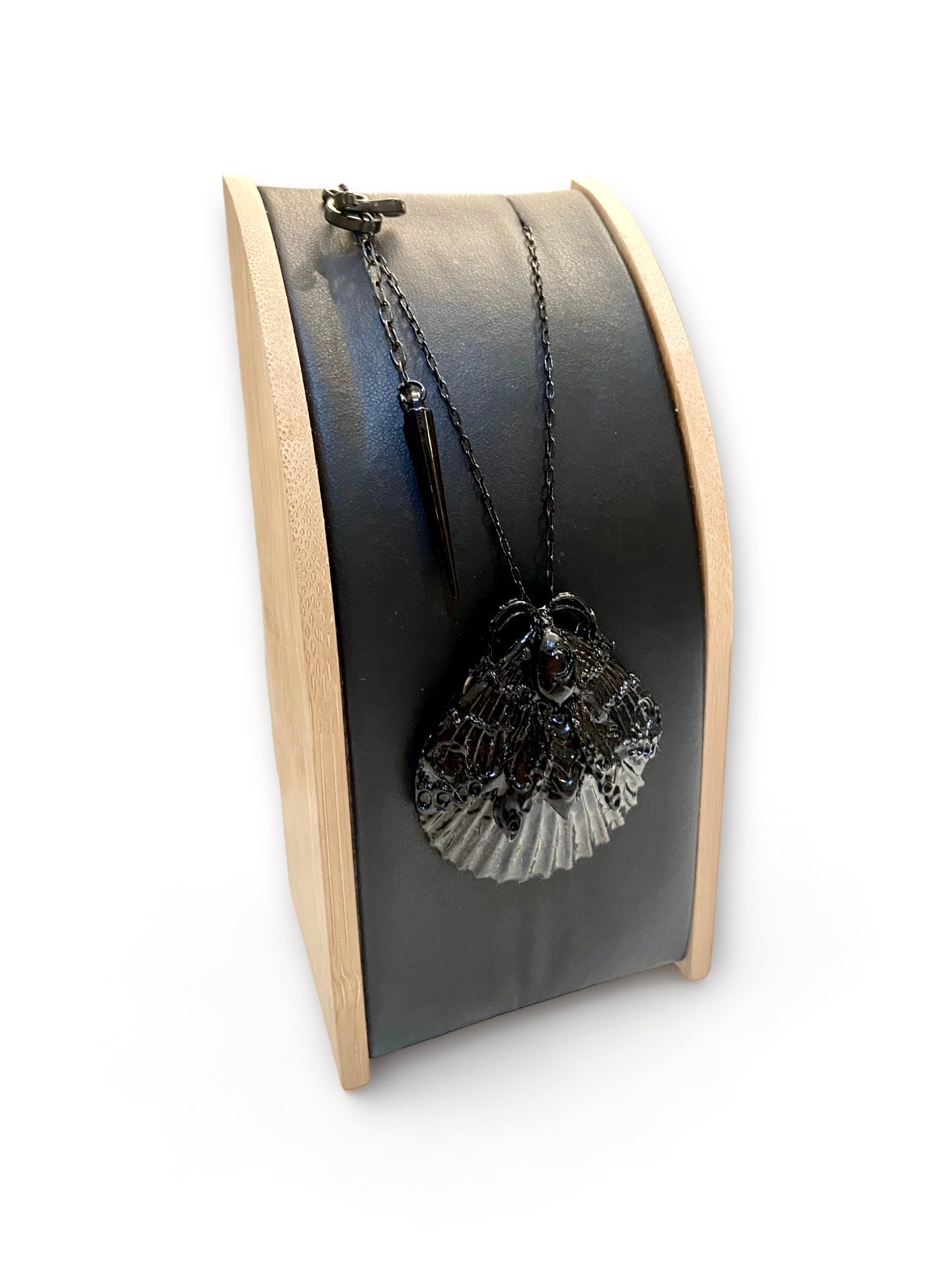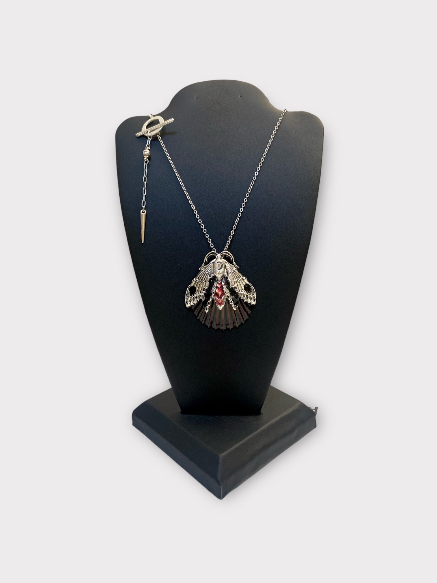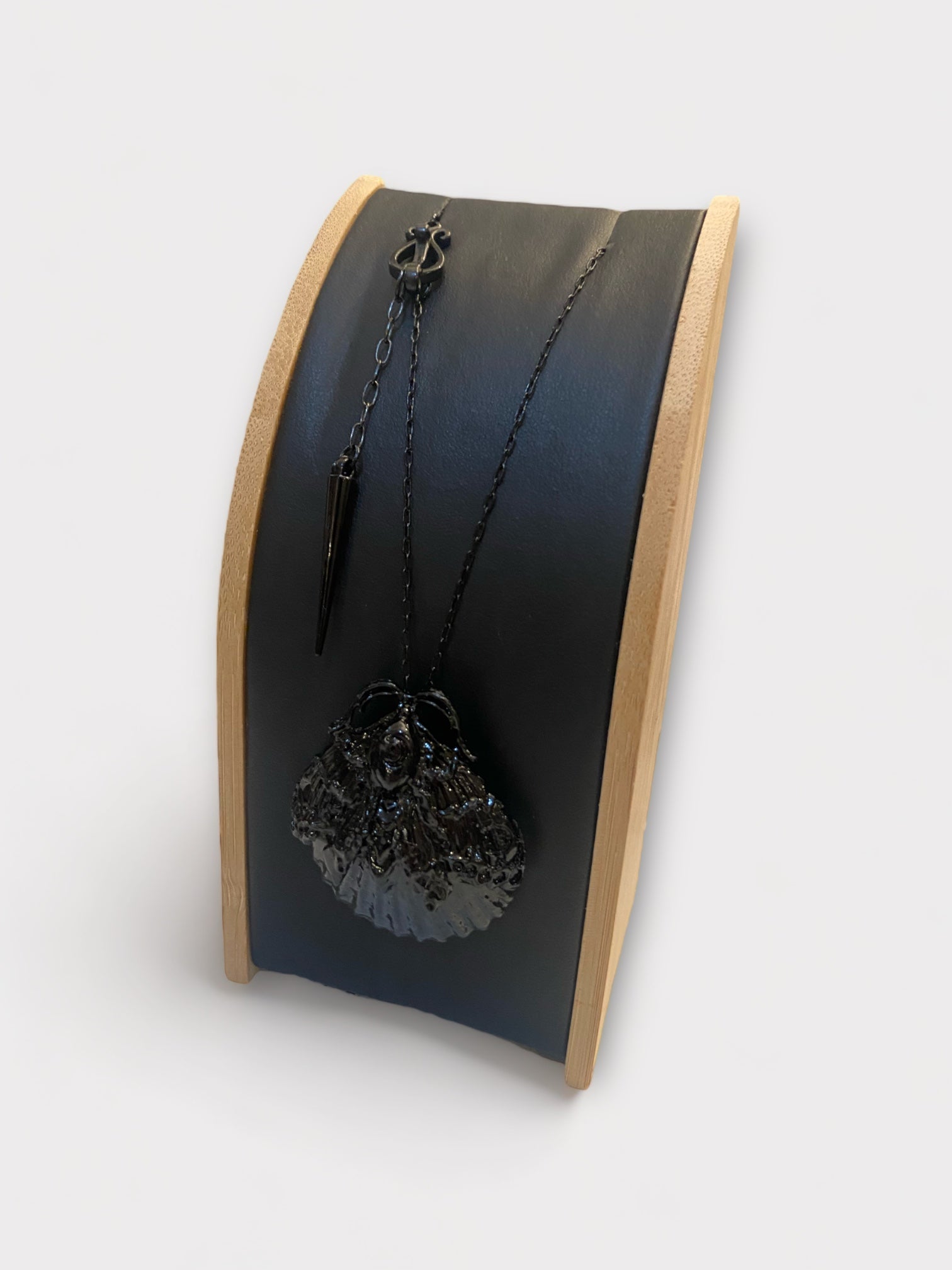 The NOCTUIDAE line features delightfully-detailed moths perched on polished scallop shells. Pendants measure 1-2" on 20" chains, and are finished with SGJ's signature toggle closure and cone rivet clasp charm. Available in CLOUDED SILVER, BLACK WITCH, and CINNABAR.
