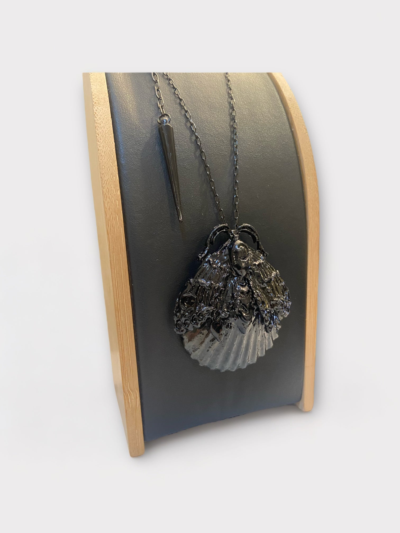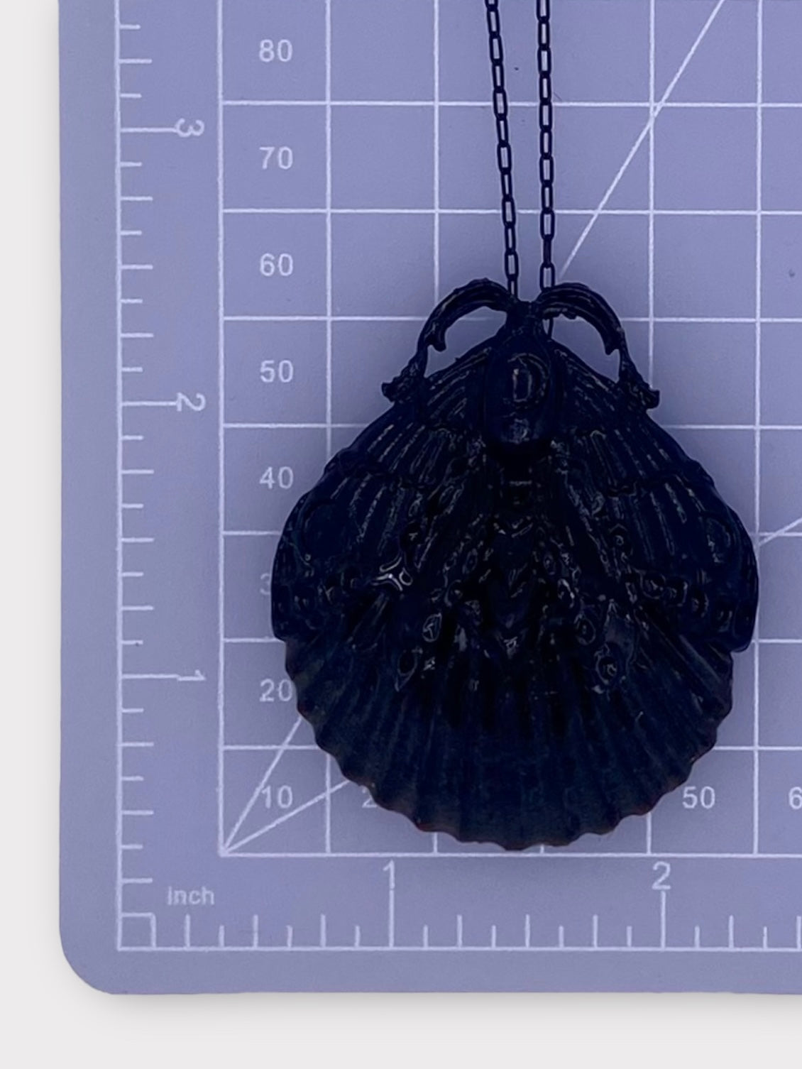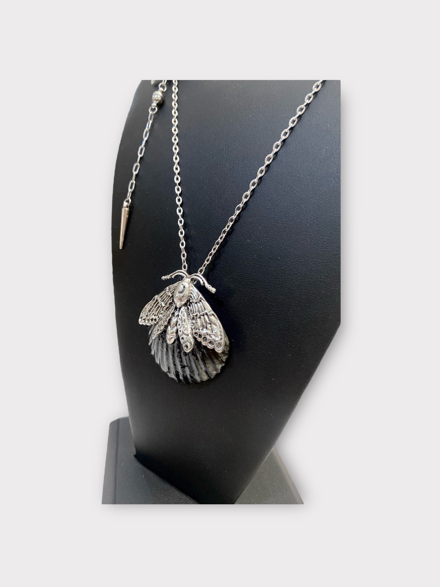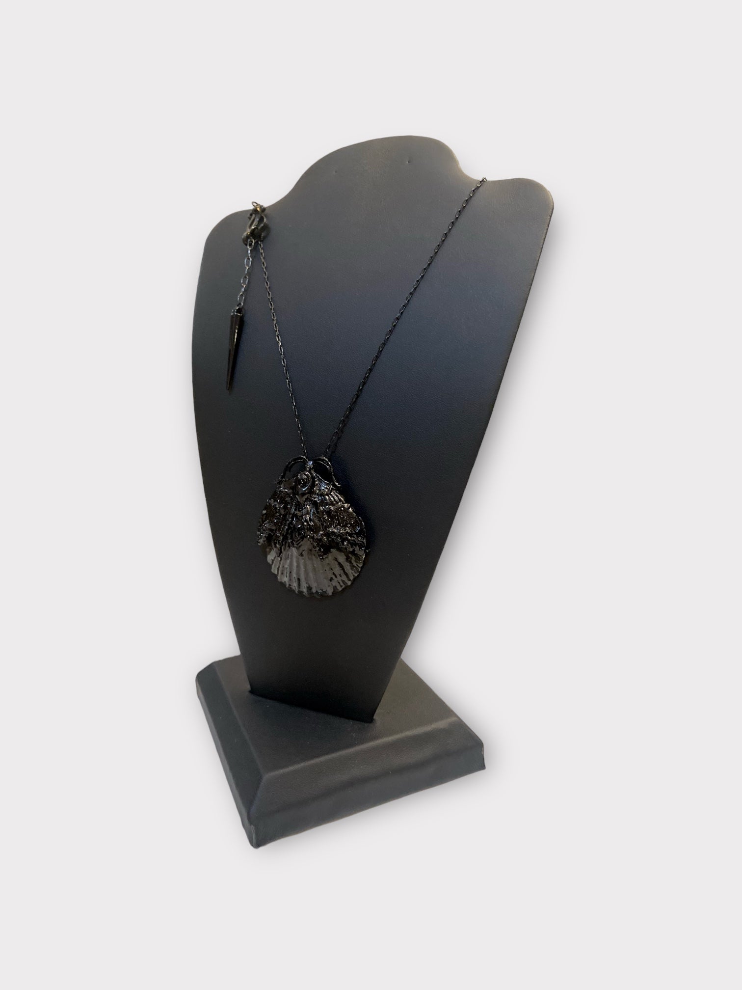 The NOCTUIDAE line features delightfully-detailed moths perched on polished scallop shells. Pendants measure 1-2" on 20" chains, and are finished with SGJ's signature toggle closure and cone rivet clasp charm. Available in CLOUDED SILVER, BLACK WITCH, and CINNABAR.