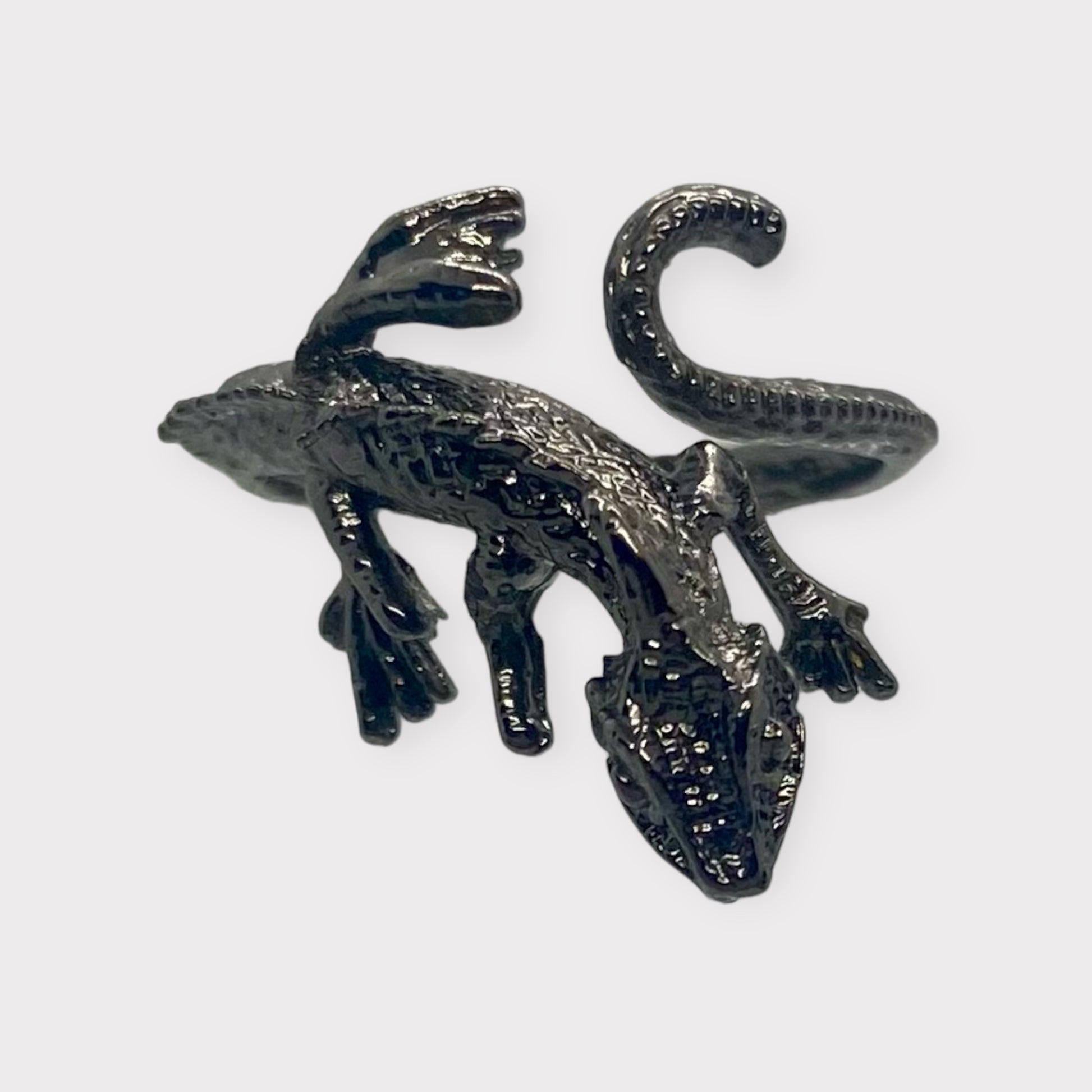 This gunmetal-tone bearded dragon perches on any sized fingers.