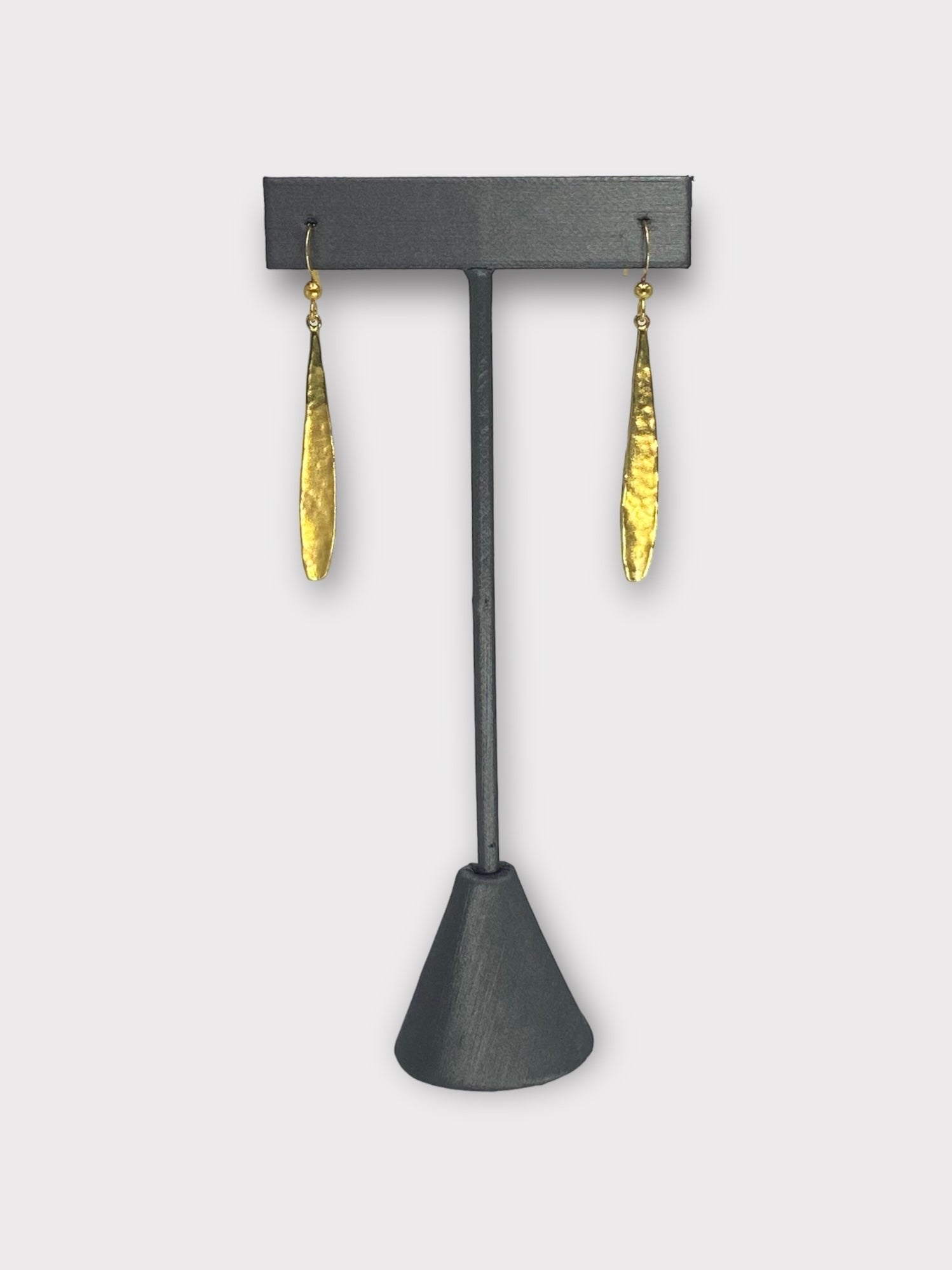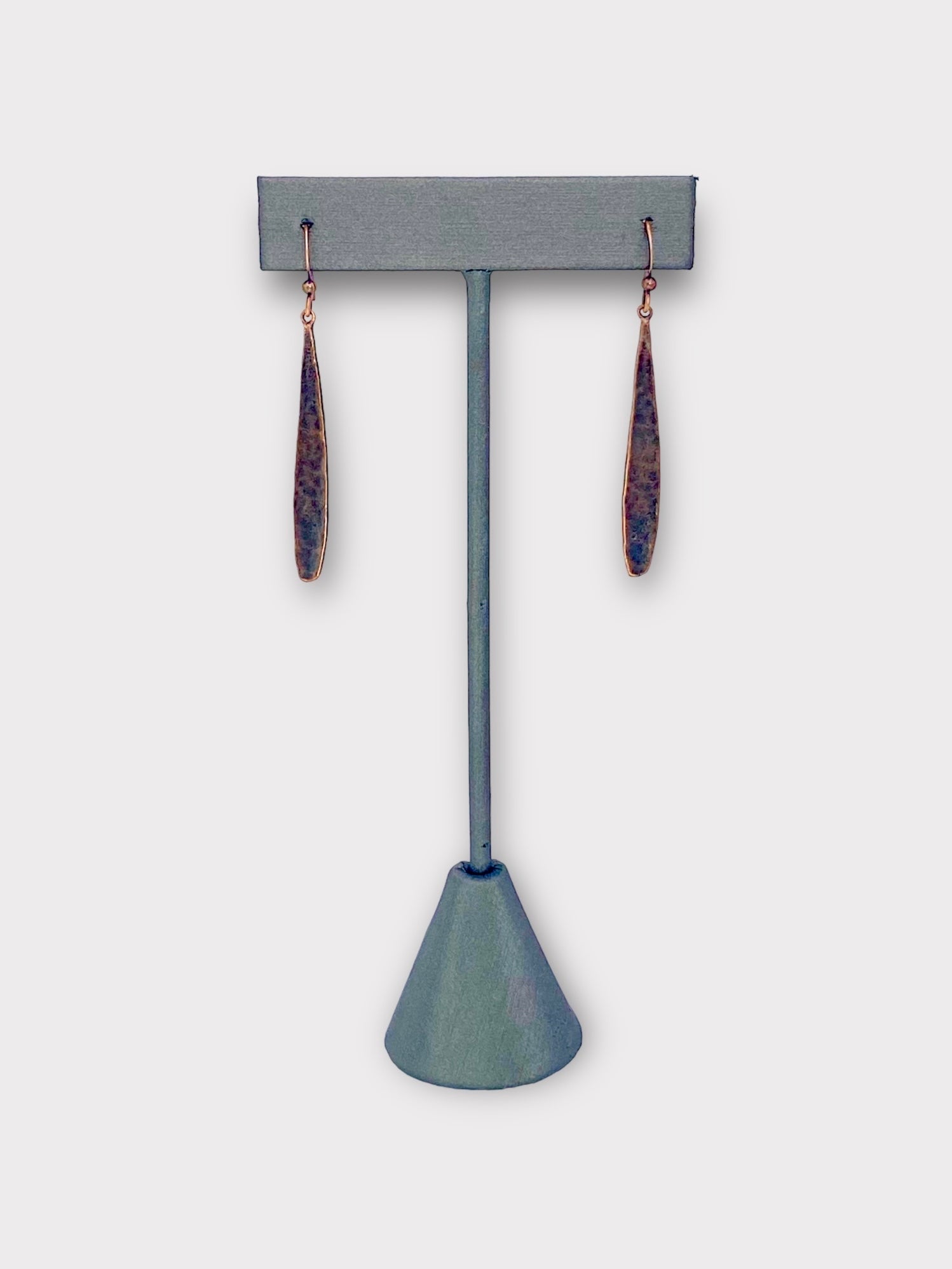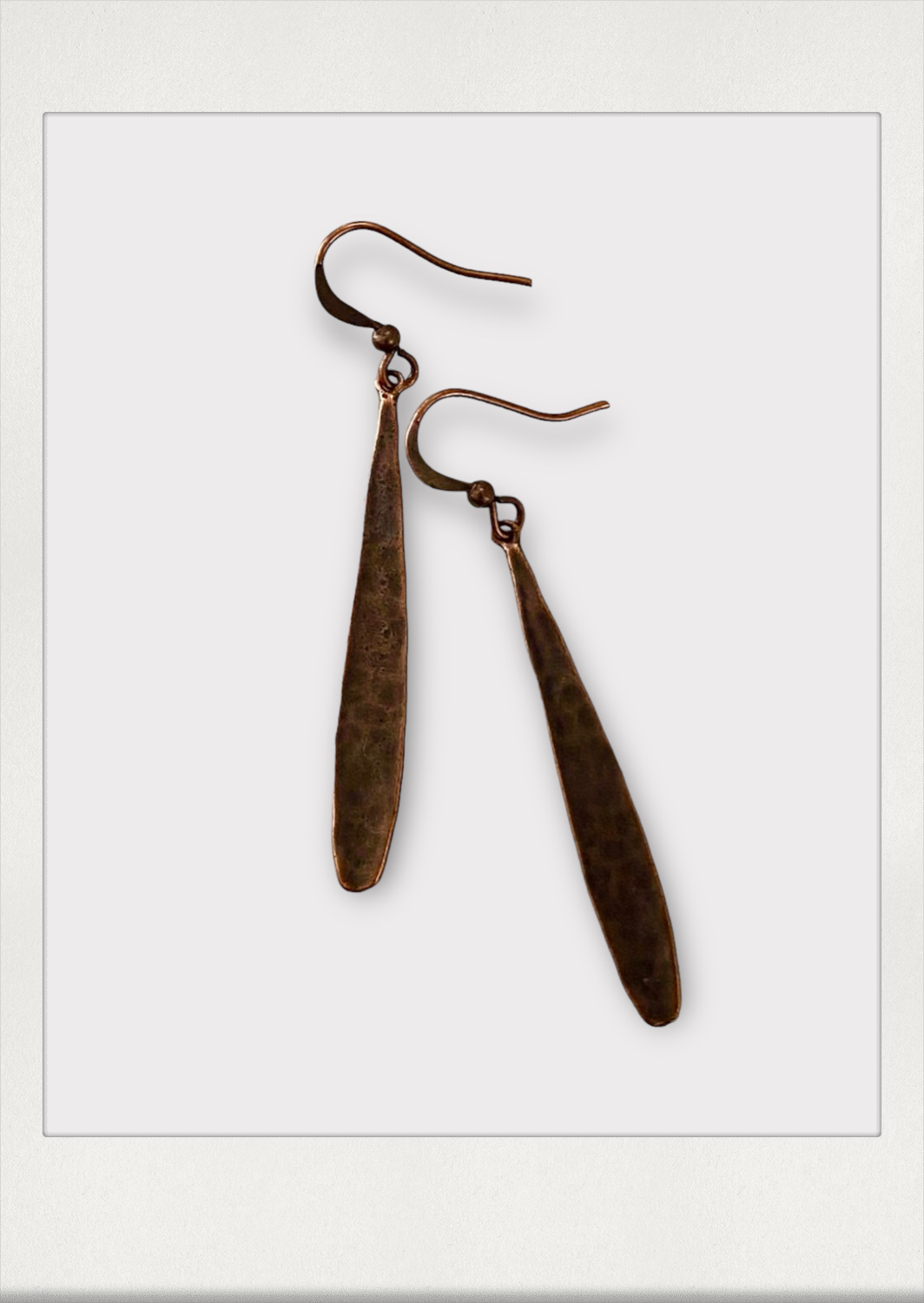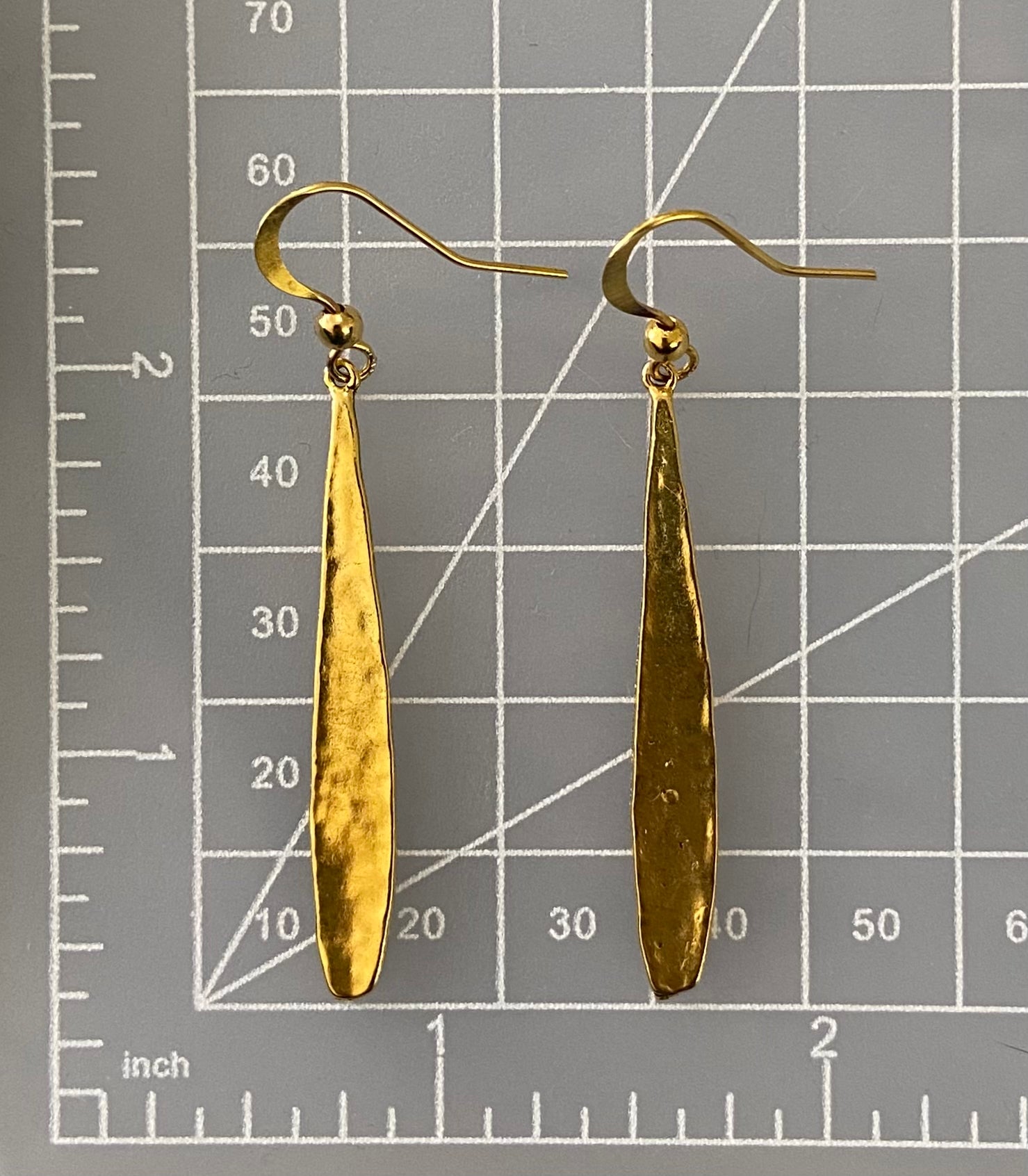 These elegant earrings feature elongated teardrops I'm hammered gold, copper, bronze, or silver.