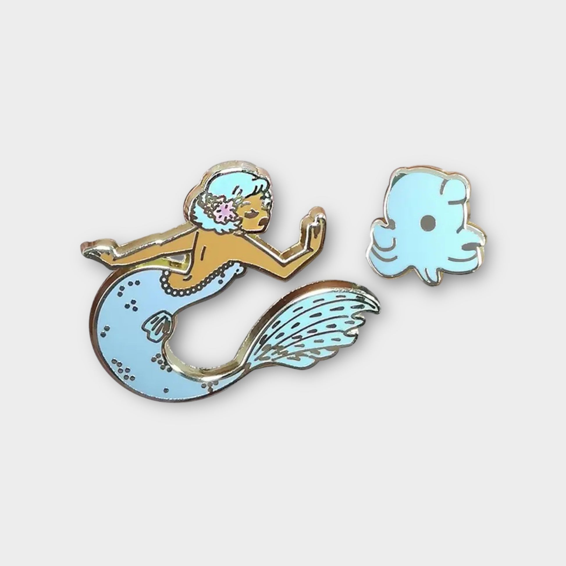 This set of two enamel pins features an elegant mermaid and her pet octopus.