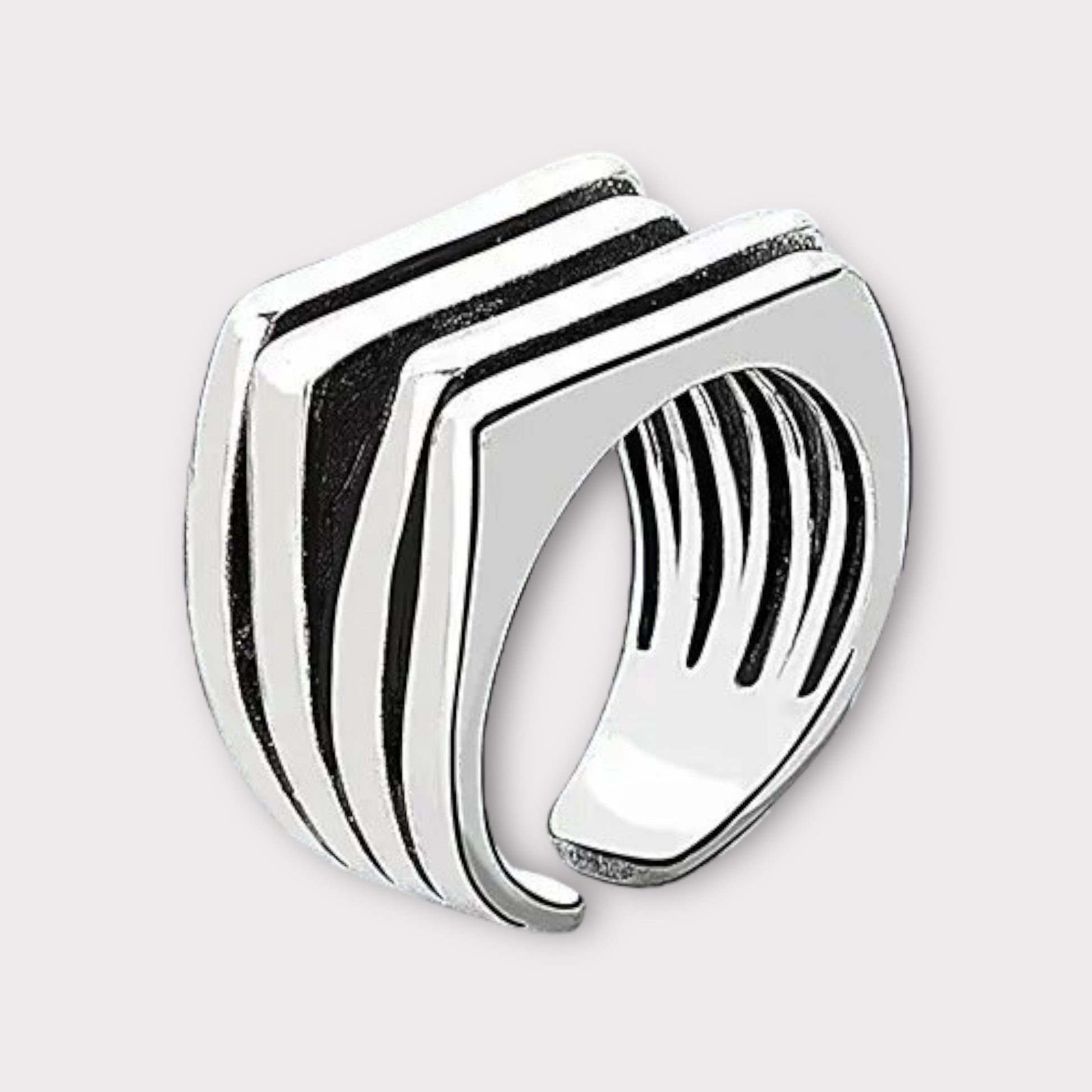 This steel statement ring adjusts to fit most fingers.