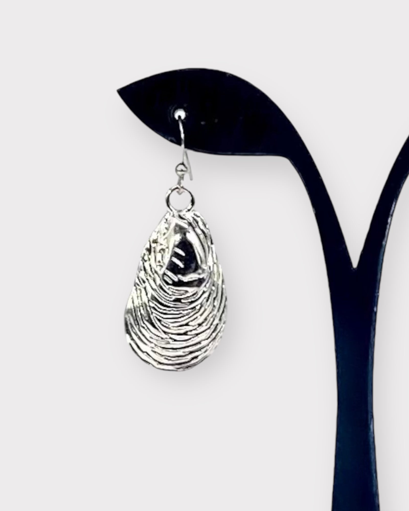 These elegant silver-tone oyster shells hang on simple fish hook posts.