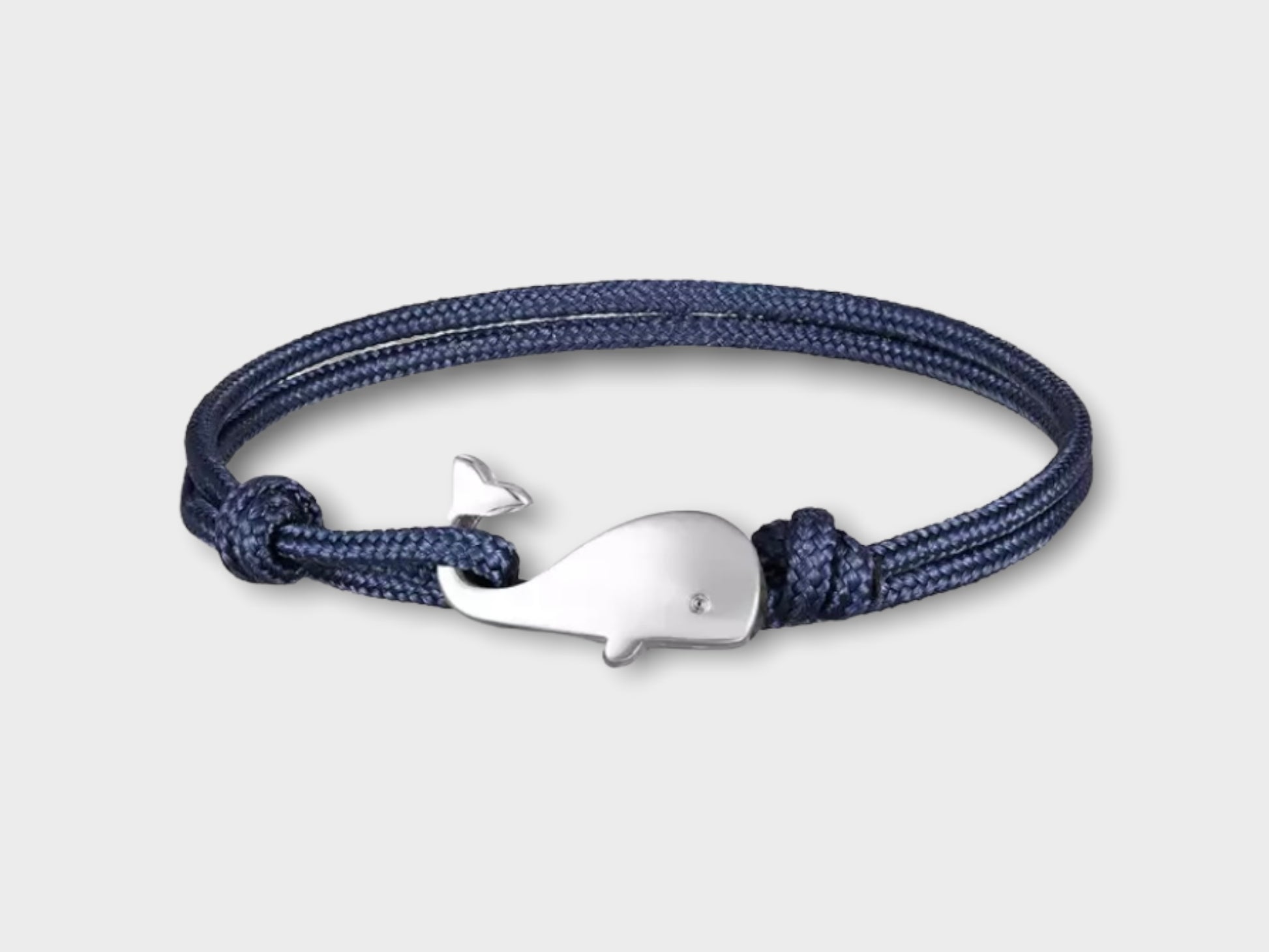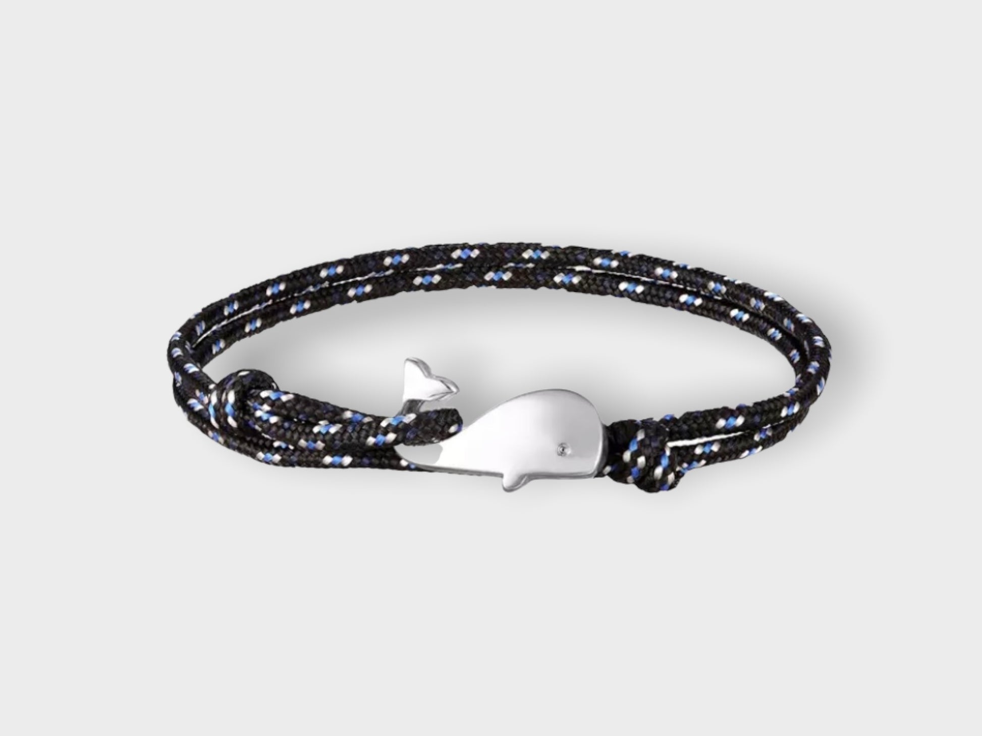 The WHALE TAIL BRACELET features a small, silver-tone whale clasp on a casual adjustable cord. Available in three colors.